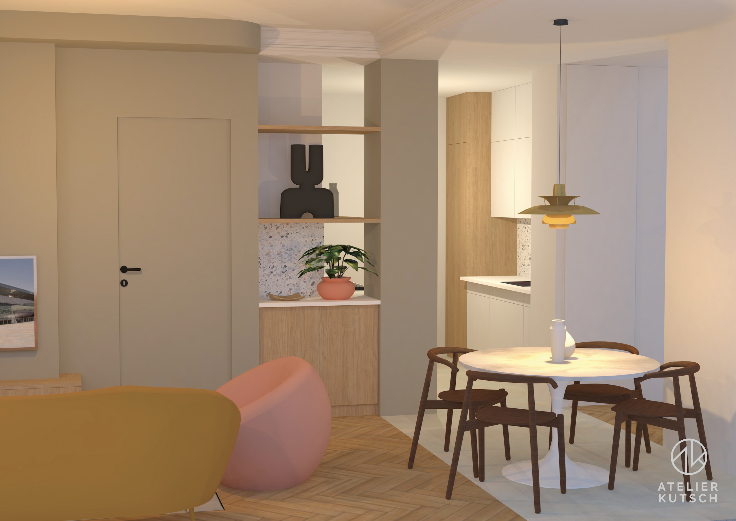 La demande consistait à aider de futurs acquéreurs à se projeter dans un projet de transformation de ce T2 en T3. Pour ce faire nous avons proposé une nouvelle configuration de l’espace pour les convaincre dans l’acquisition de ce bien.