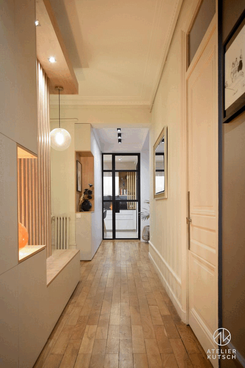 Dans ce projet, nous avons réalisé une grosse restructuration de l’entrée et du couloir distribuant de nombreuses parties de cet appartement.