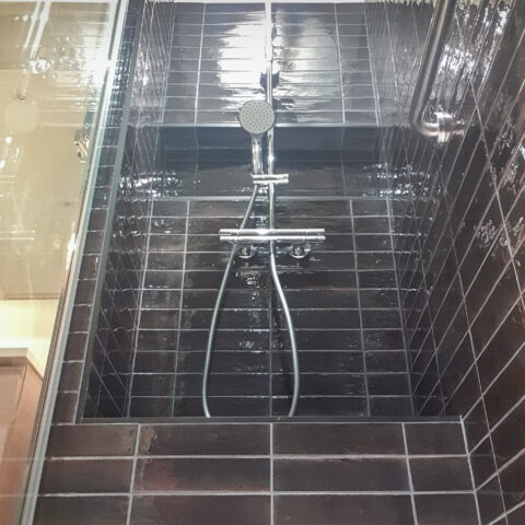 Nous avons donc remplacé la baignoire par une grande douche. Un banc en fond de douche lui permet à présent de s’assoir au besoin. Une grande niche a été créée pour poser ses produits de soins, gels douche et shampoings.
