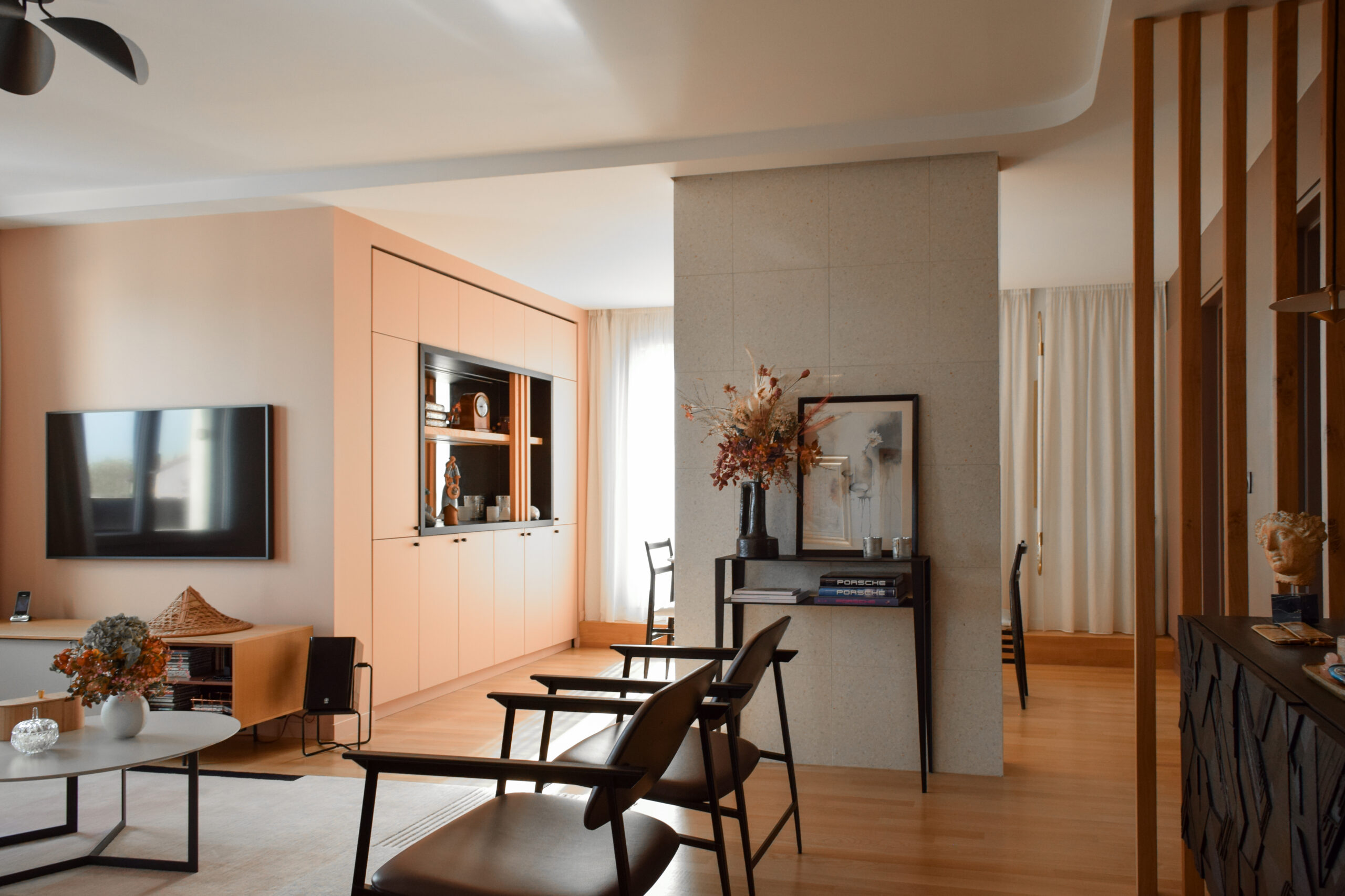 Nous avons créé un grand meuble rose poudré fondu dans un mur composé de caissons IKEA, agrémentés d’une niche noire et de portes teintes sur-mesure.