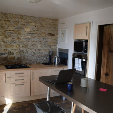 La cuisine, située dans la partie ancienne de la maison, a été entièrement refaite et re-modernisée. Nous avons choisi un bois en noyer pour le linéaire réchauffant la pièce. Le plan de travail blanc, contraste et donne une belle luminosité. La colonne du four a été entièrement intégrée dans le mur.