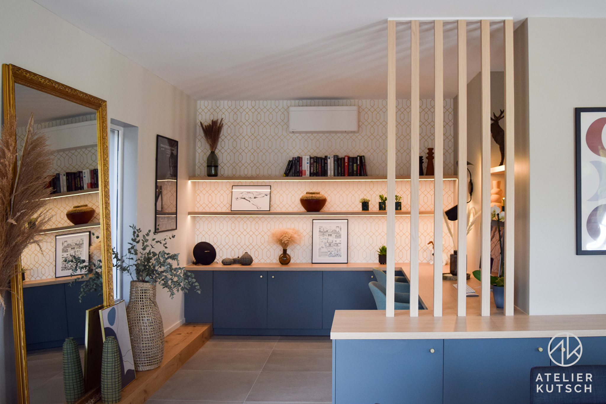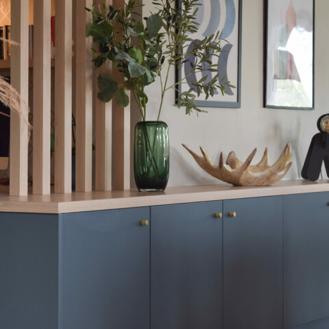 L’ancienne zone salle à manger a été transformée en bureau. Ce dernier offre à présent de nombreux rangements et un grand espace de rangements dans le coin réception / repas en un long buffet. Le claustra lui, sépare la zone bureau et la zone réception.